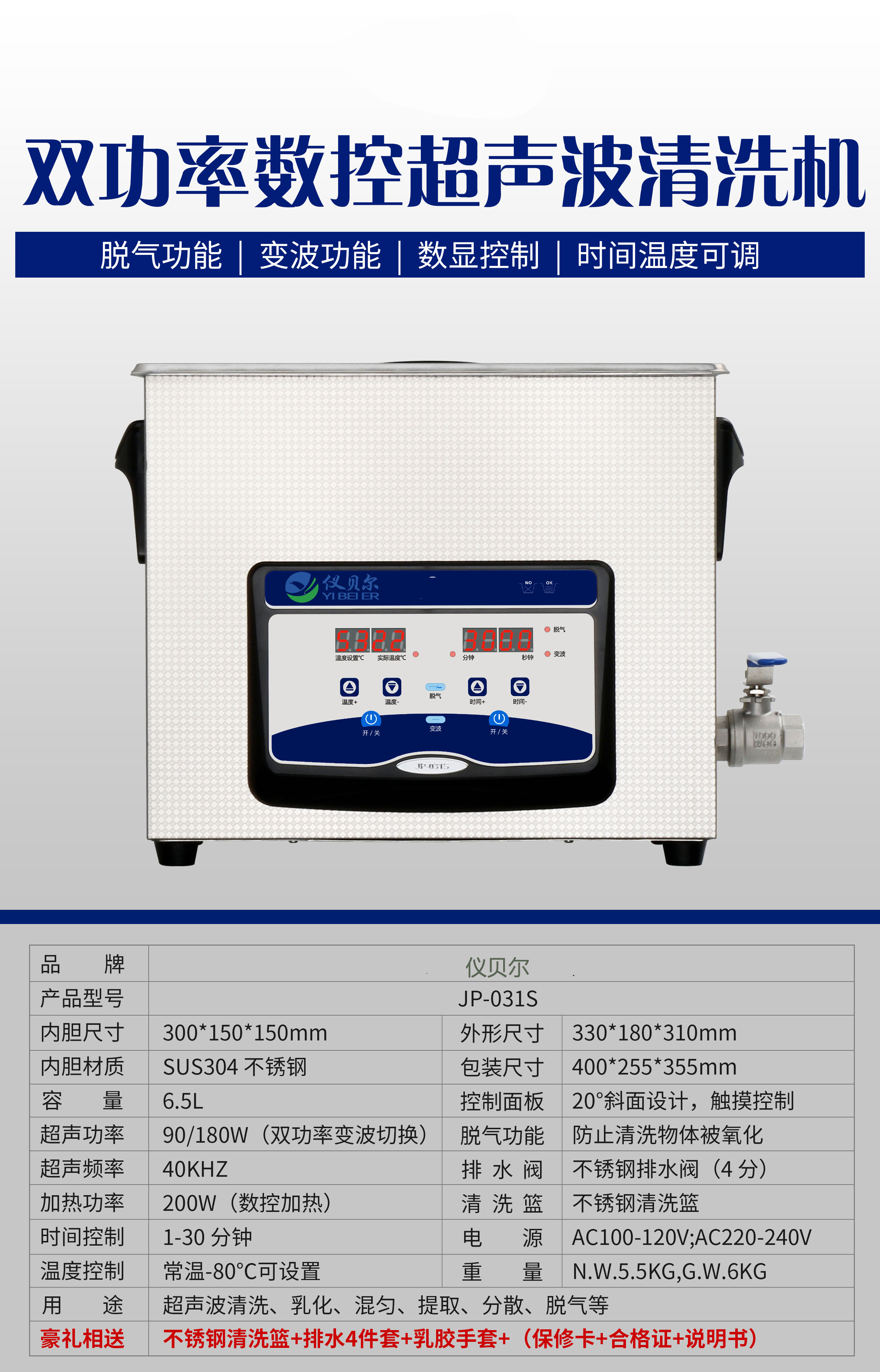 031S台式超声波清洗机JP列功率可调型超声波清洗器适用于各种五金件精密零件,冲压零件等工厂企业小批量清洗科力超声波清洗器可应用于各种精密零件脱脂除锈清洗,配备工业型40台式超声波清洗机KHz、高效超声波换能器,超声波清洗机容量从3.2L -30L多种规格可选。